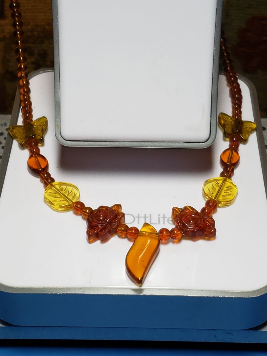 Amber Botanical Necklace – Carved Leaves, Butterflies & Roses