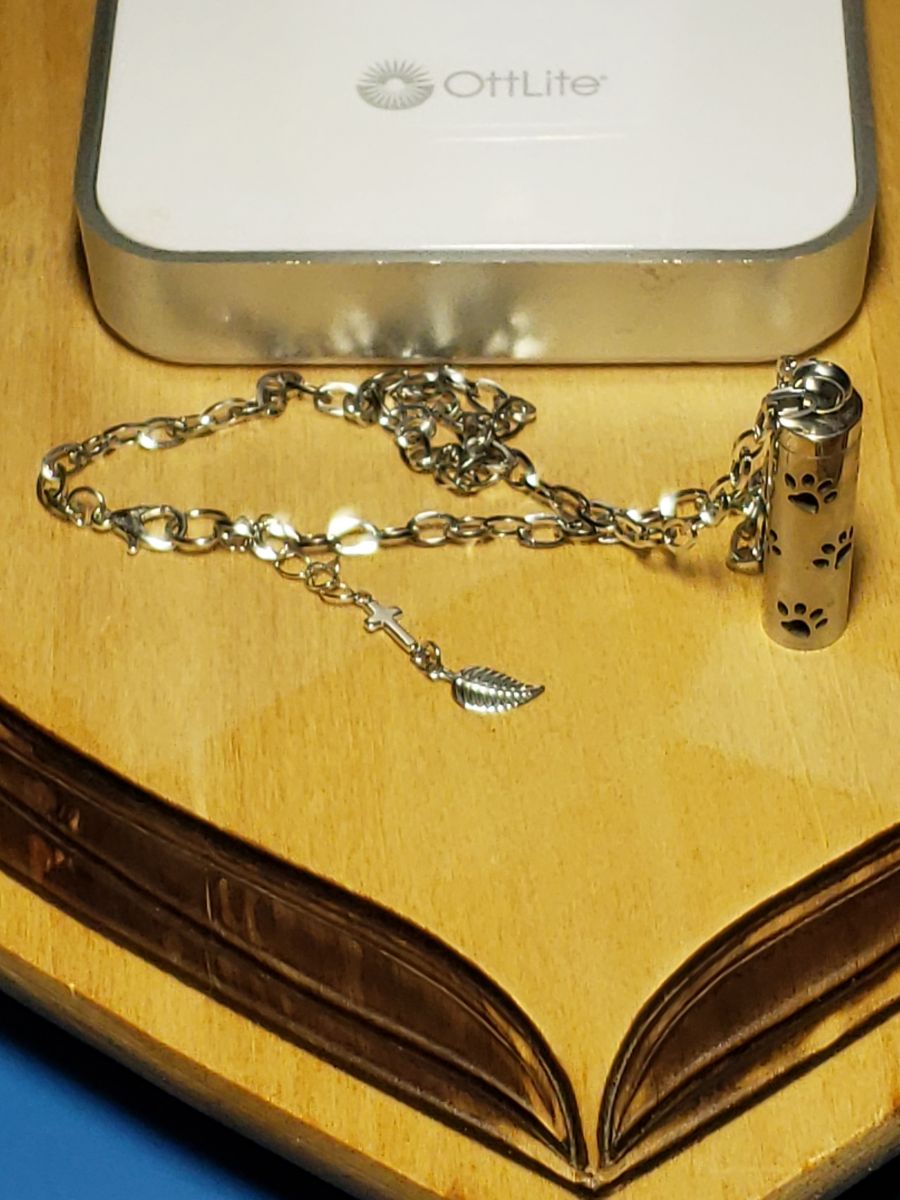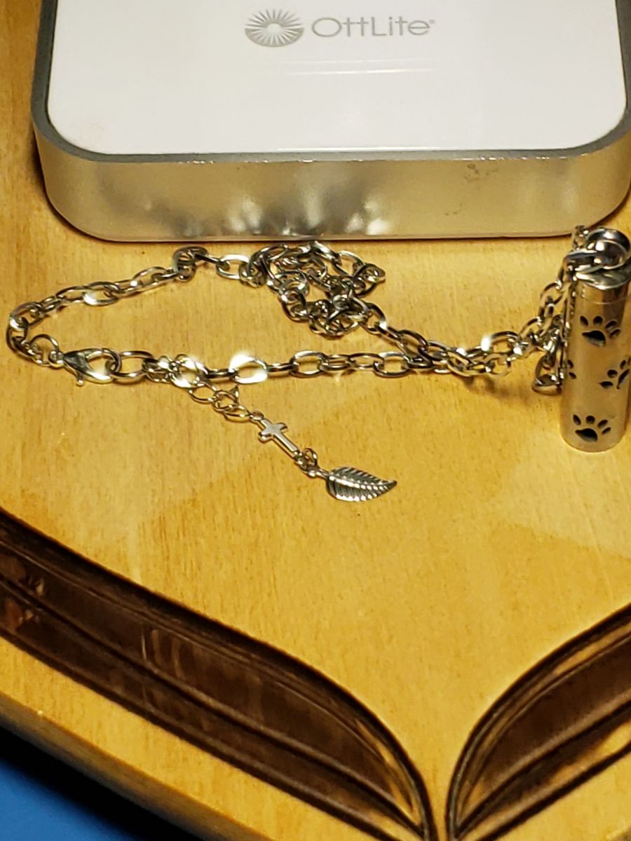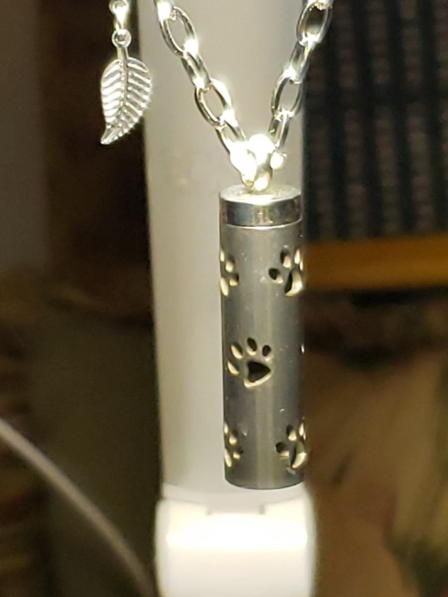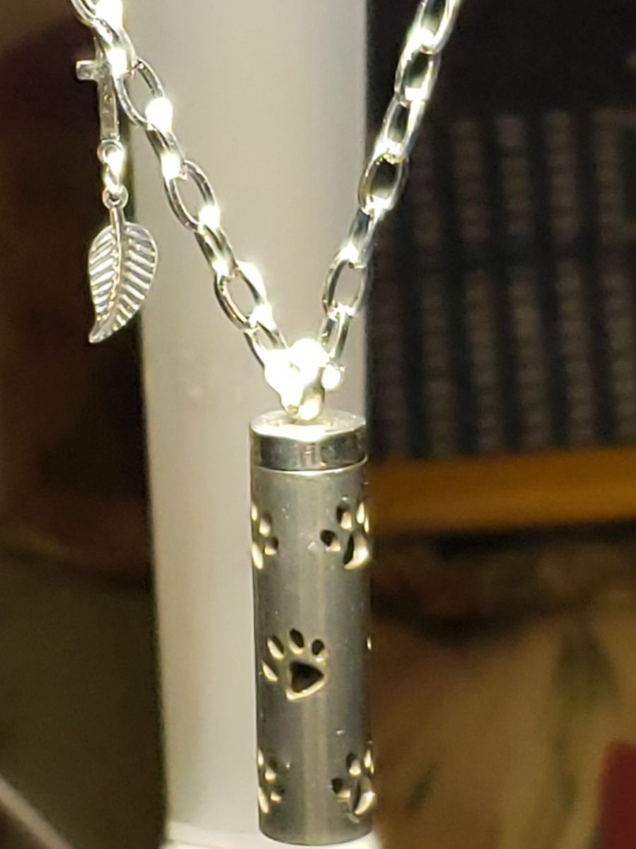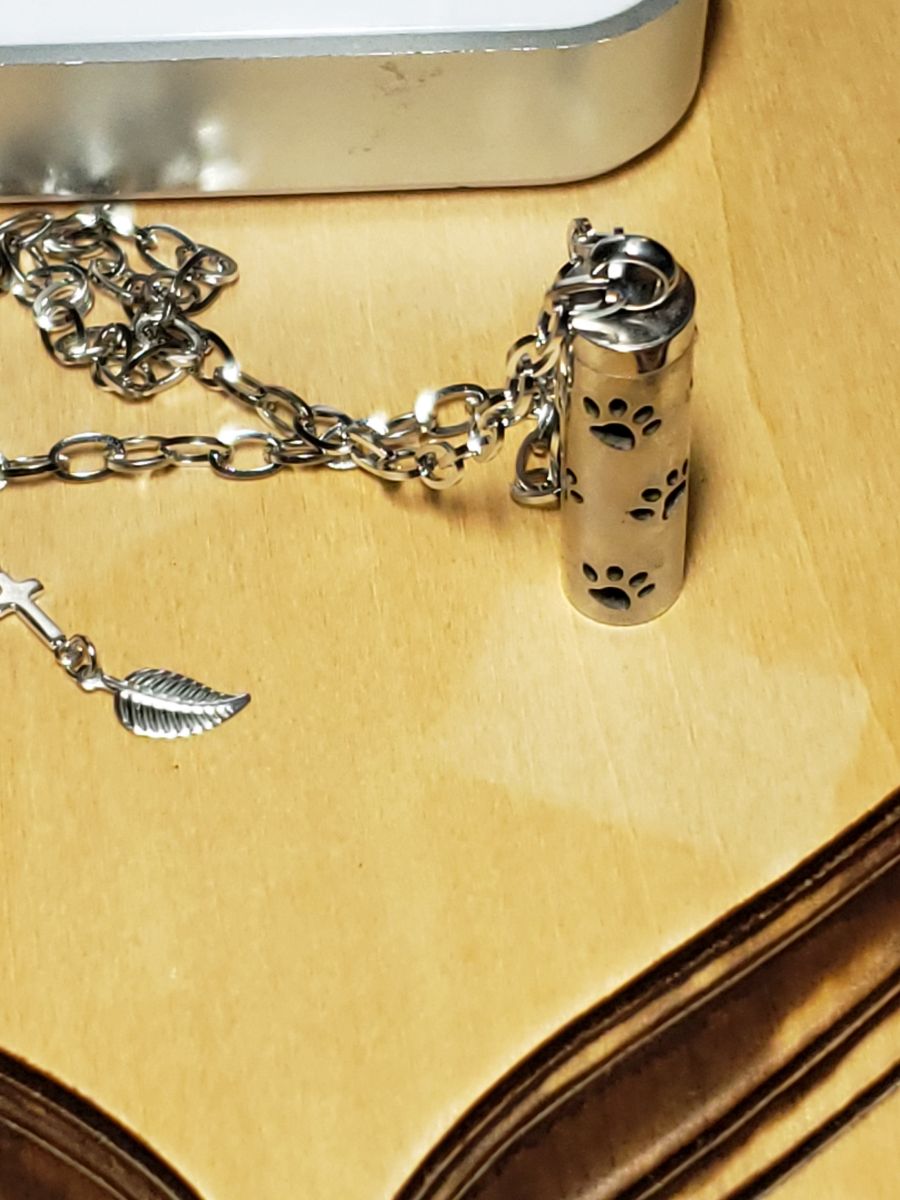 Elevate your everyday style with this Aroma Therapy Doggy Paws – Necklace. Featuring a solid stainless steel container (filter inside) imprinted with your choice of cut and a silver non-blemish chain.This also features a scent that has your back at all curves in life. Aroma Therapy Doggy Paws – Necklace will go noticed day or night. Your aroma will follow you everywhere. Very long lasting. (Mine has Patchouli oil and has never had to be re-scented & it’s been 4 years ago that I made it) The proof is in the wearing! All oils are 100% organic, from all natural resources. From all over the world! You’ll love it, just name your scent.