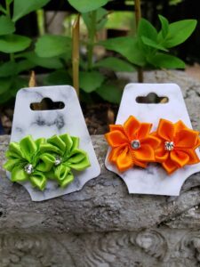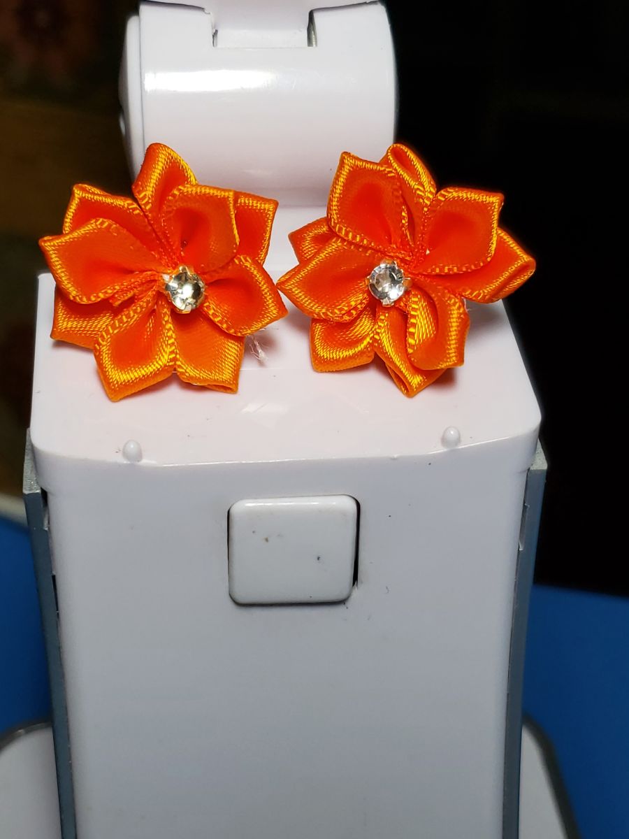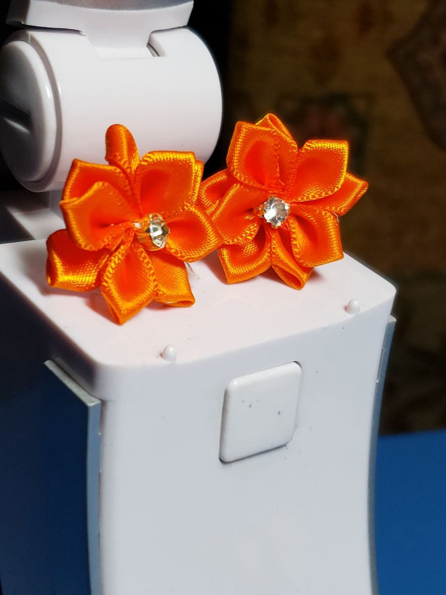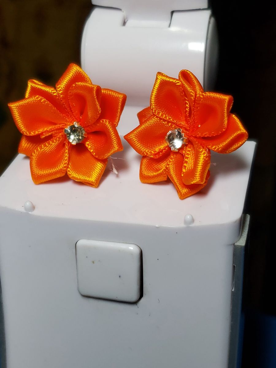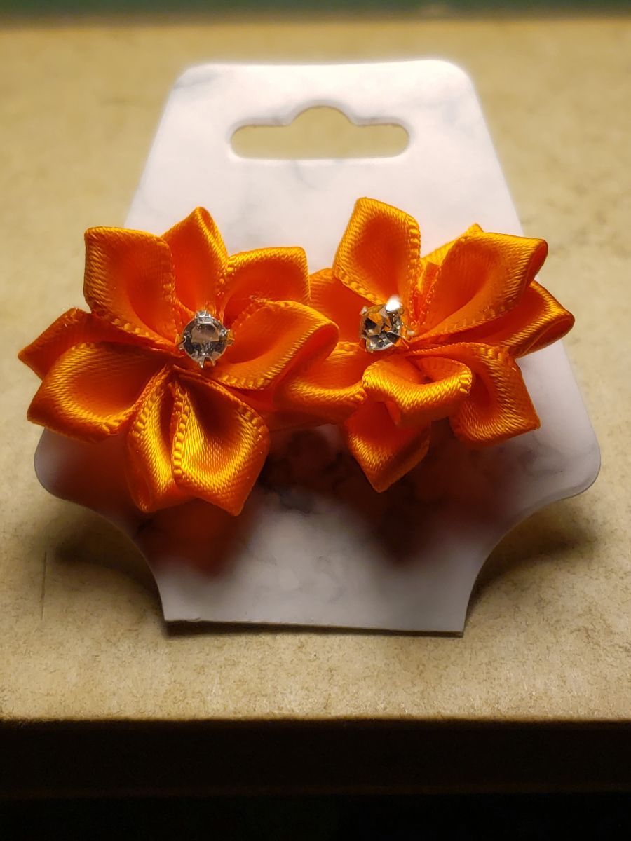 Elevate your everyday style with this Single Satin -Orange Gemstone Earrings Featuring a Beautiful rhinestone centered in the flower. Great for proms, weddings, graduations, or just a focal point to you matching wardrobe. Think orange.